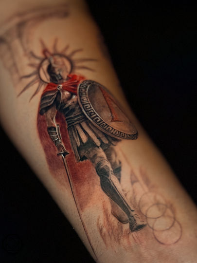 A powerful tattoo design capturing Shabih's life purpose through a Spartan warrior, Parthenon pillars, sword, fire, and the Latin phrase 'Memento Mori.'