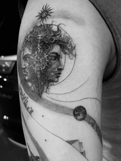 This tattoo is inspired by Ulric's life and growth, symbolizing the journey of acknowledging the past while moving toward the future. It captures his story of freedom and happiness through elements of civilization, evolution, space, and nature.